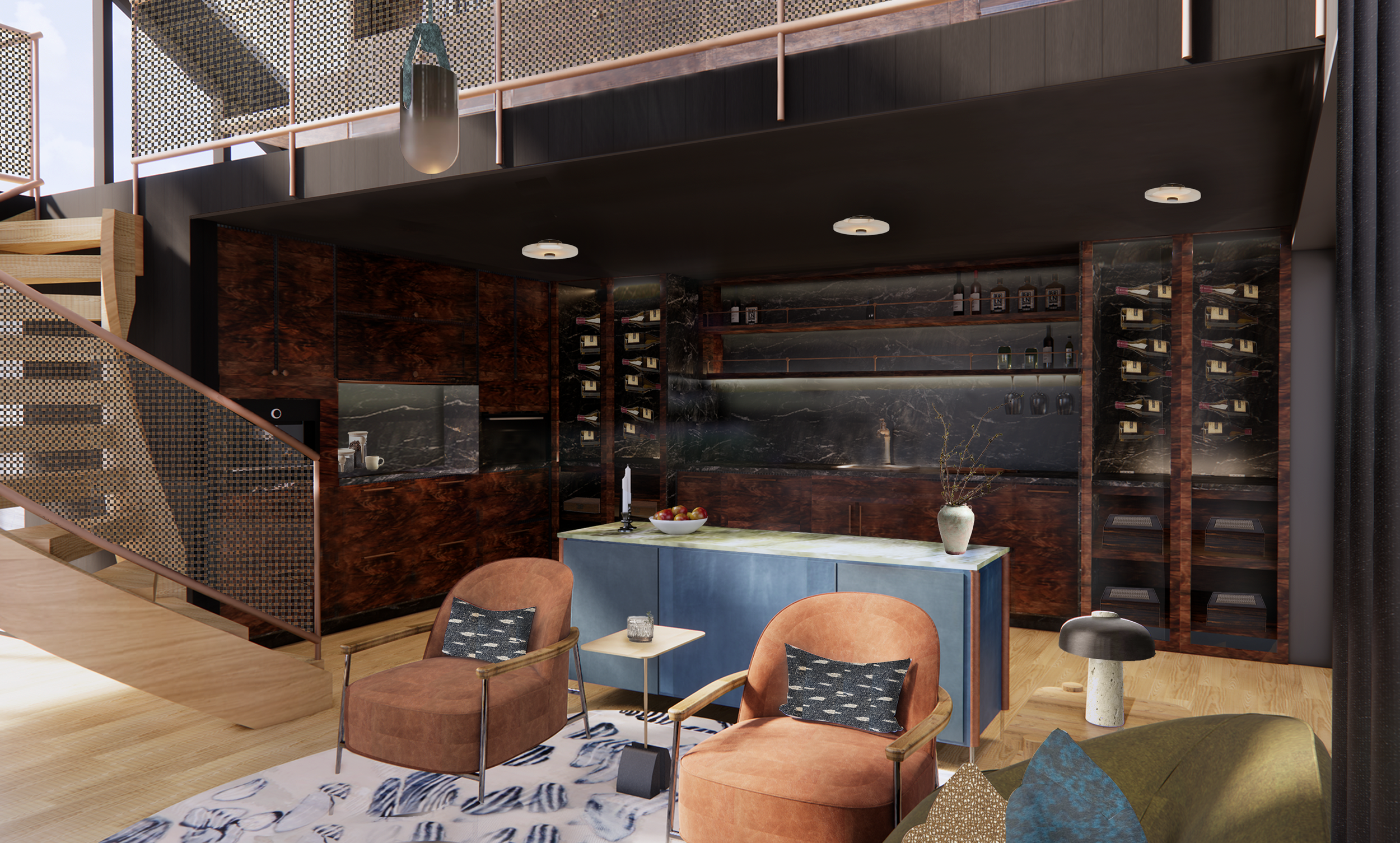 Cozy Cabin Floating Home is like the classic heirloom timepiece that has been passed down by generations, while Jewel Box Boathouse is a more sleek, modern take on refinement and reverie. This design of the space celebrates features modern and artful forms, rich deep tones, fine detailing and craftsmanship, luxurious textures, and plenty of wine, spirits, and cigars.